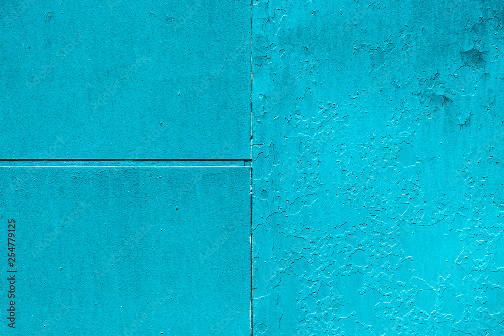Imperfect metallic plate. Cracked paint close-up. Damage texture in macro. Grungy metal panel. Textured background. Rough faded uneven iron wall. Obsolete surface. Peeling of old paint. Flaking of dye
