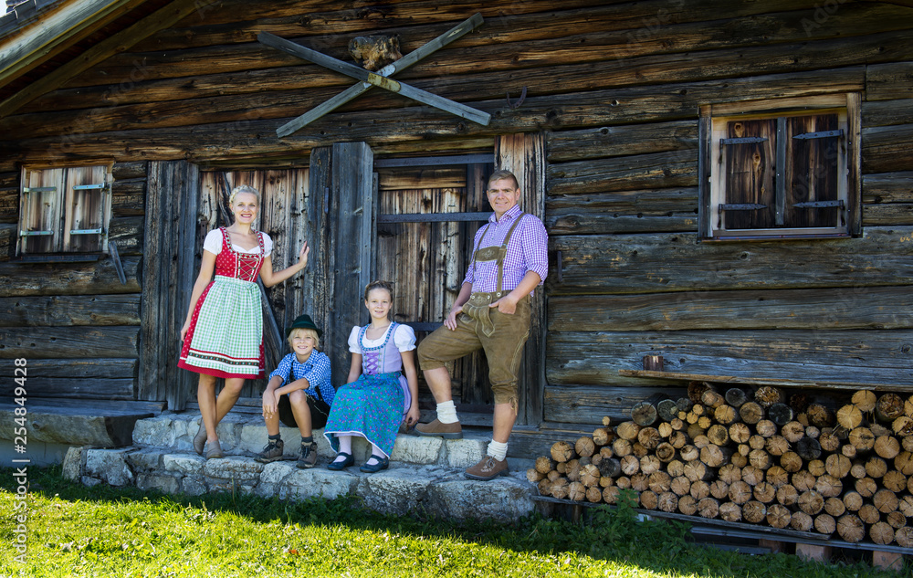 Young Bavarian family in a beautiful mountain landscape. Happy parents and smiling kids in traditional Bavarian clothes at an old hut