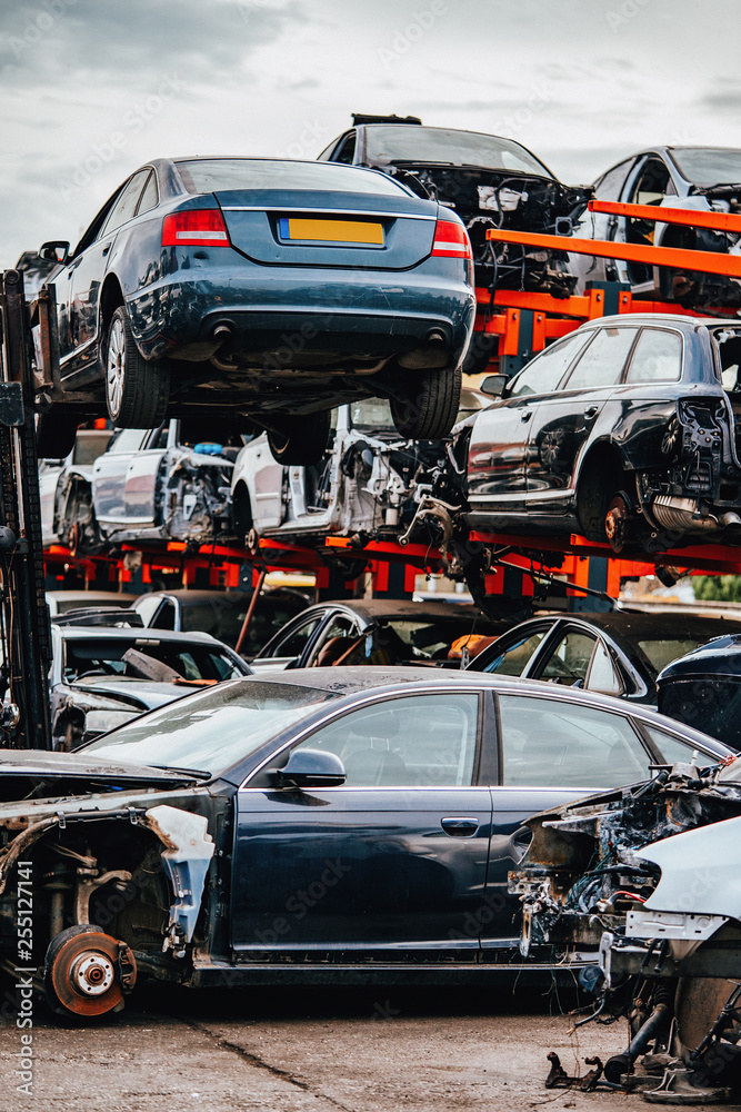 Damaged cars waiting in a scrapyard to be recycled or used for spare parts