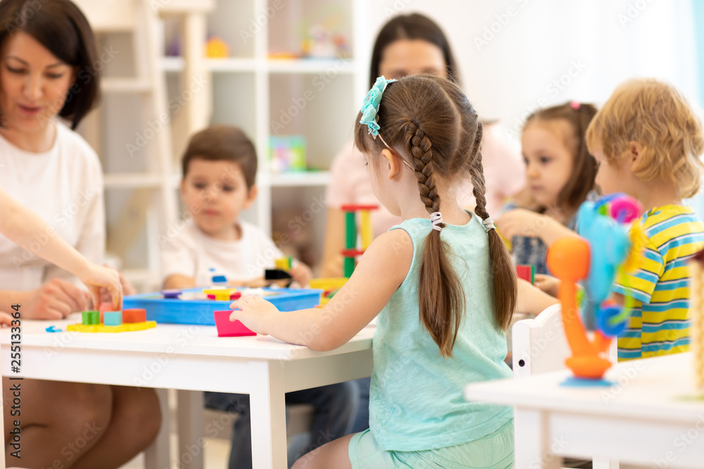 Teacher and assistant playing with children in kindergarten