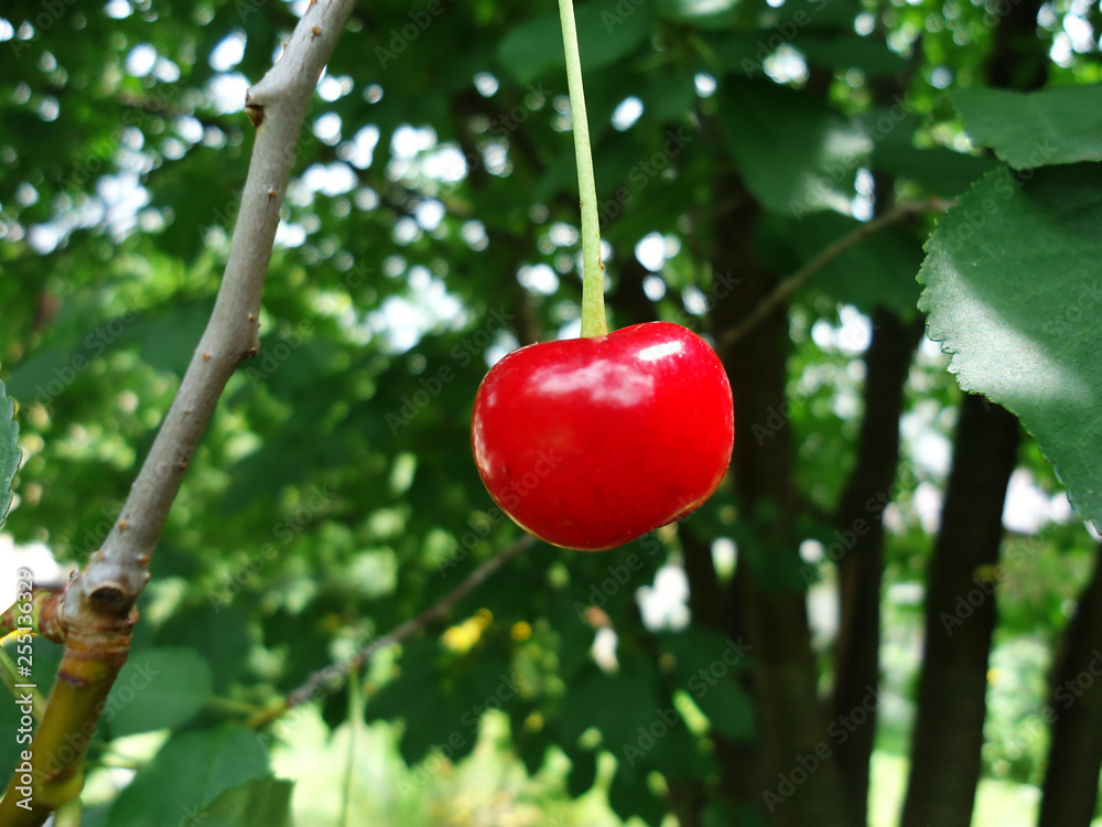 Beautiful fresh ripe tasty aromatic red cherry grows on a green branch in a summer garden