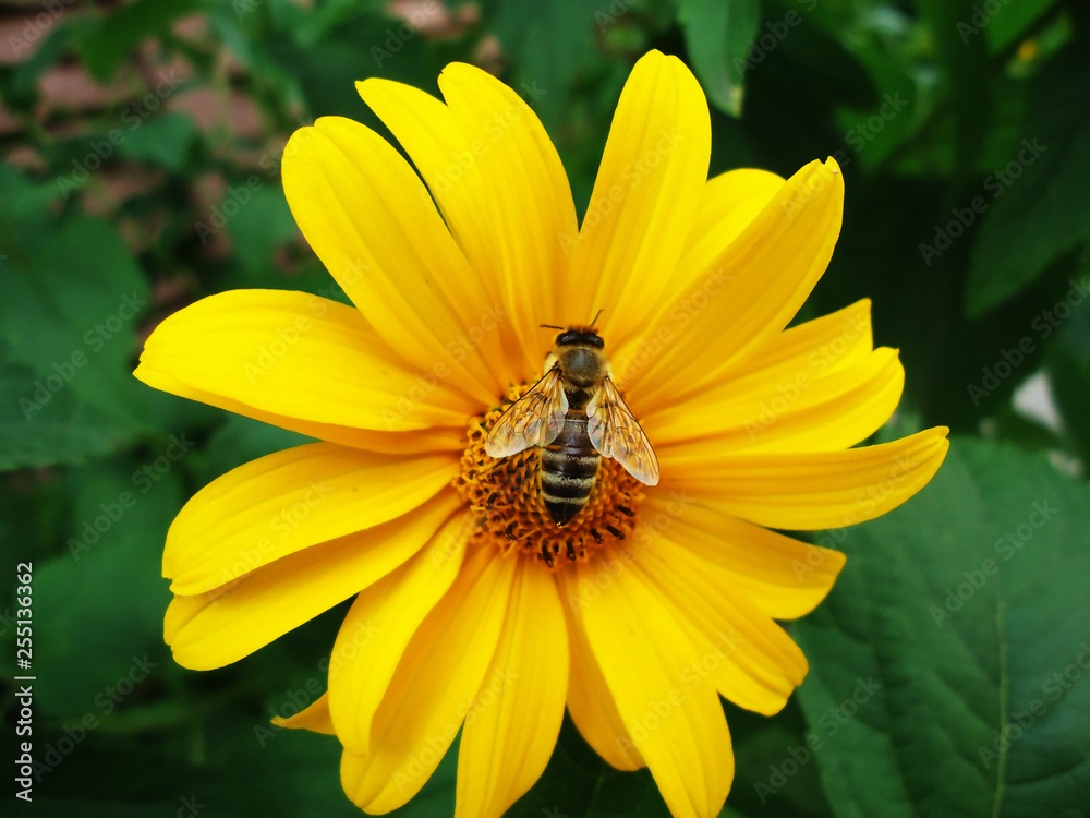 Beautiful fresh natural fragrant yellow daisy flower with a bee in the garden summer close-up