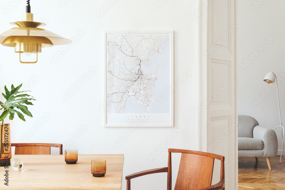 Stylish and eclectic dining room interior with mock up poster map, sharing table design chairs, gold pedant lamp and elegant sofa in second space. White walls, wooden parquet. Tropical leafs in vase.