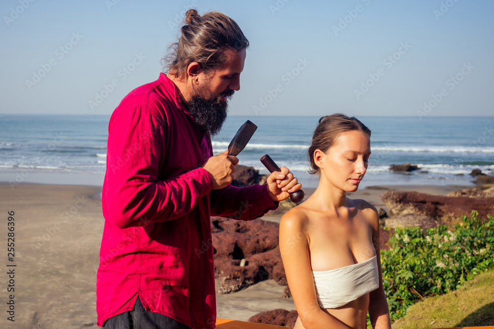 male master makes Thai massage Tok-sen spa therapy physiology by the sea ocean beach.Beautiful woman having a relaxing thai back massage with set for massage toksen,Body care relaxation resort