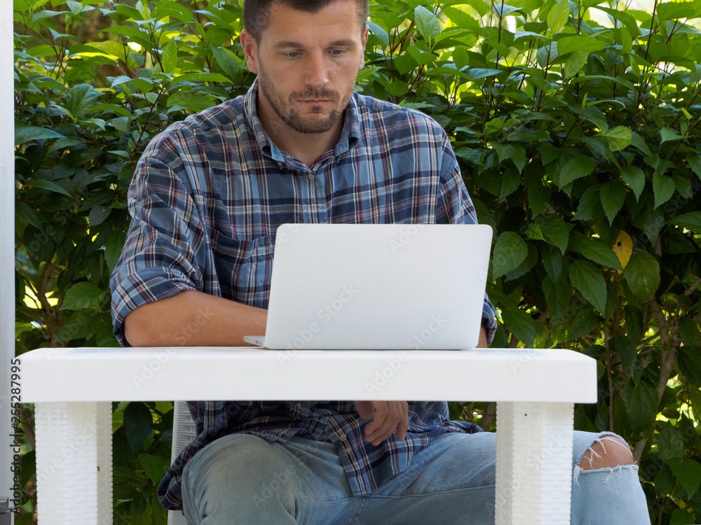 A man sits with a laptop outdoors.