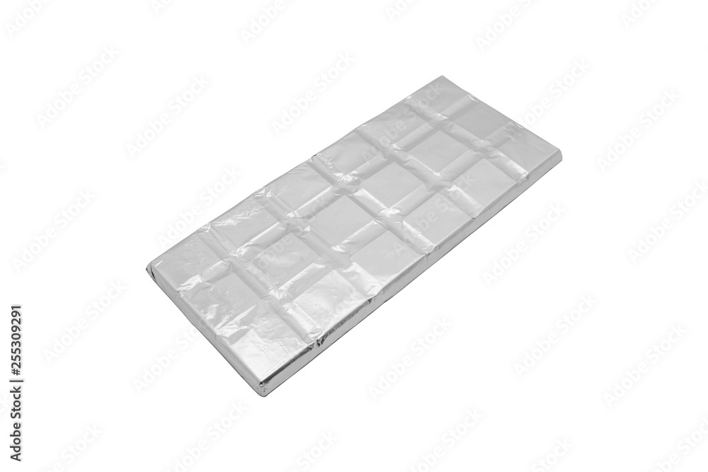 Dark chocolate bar in foil isolated on white background. Chocolate wrapped in aluminum foil on bright tablecloth