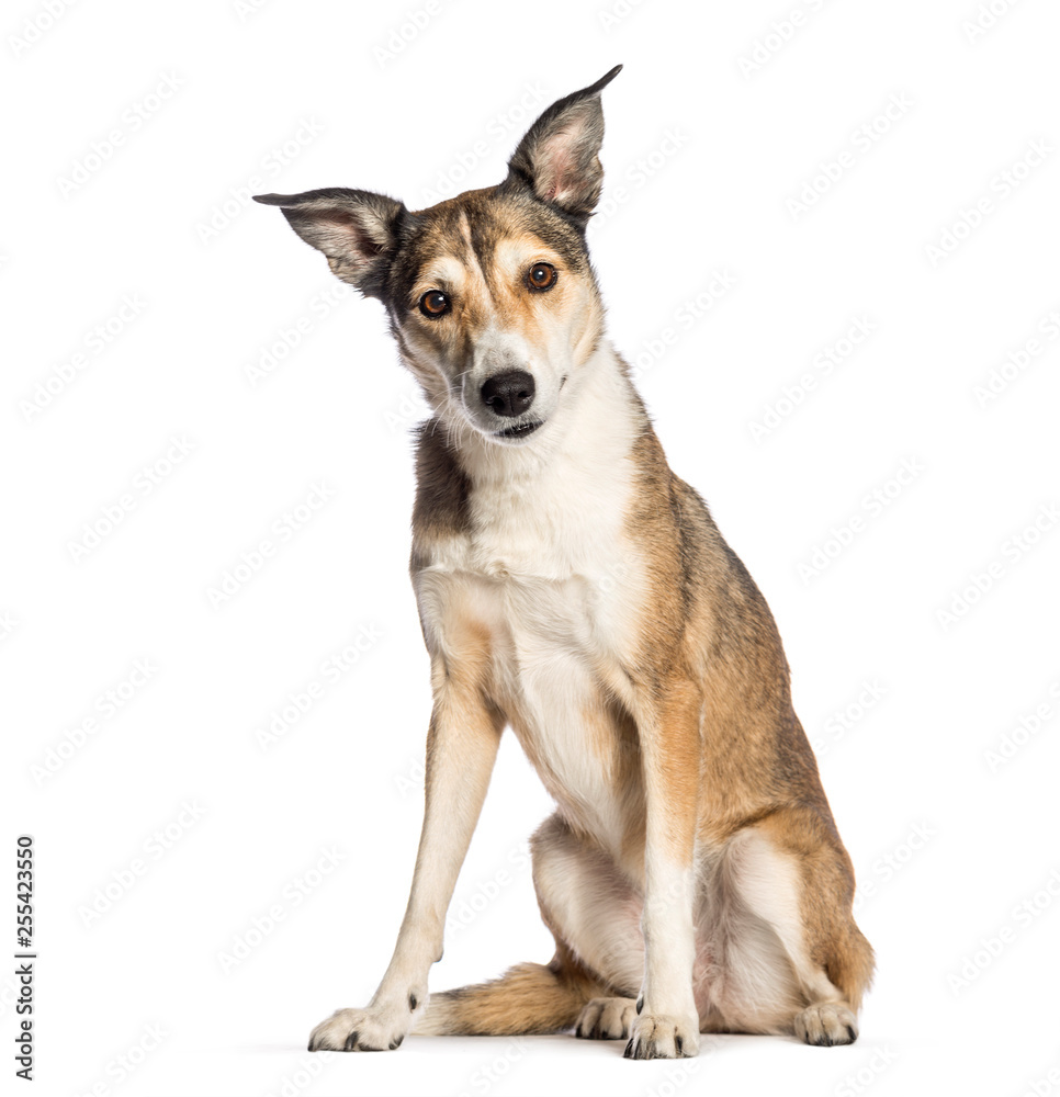 Mixed-breed dog, 8 years old, sitting in front of white backgrou