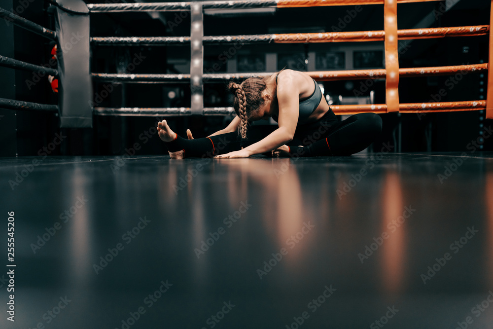 Full length of Caucasian female boxer girl in sportswear stretching on floor in ring.