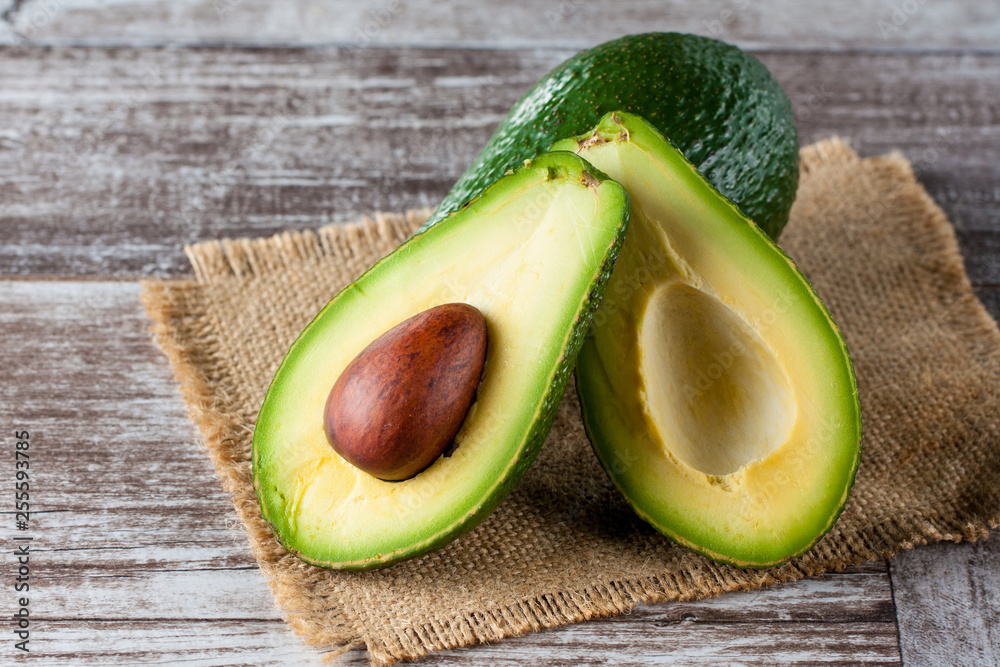 Close-up of an avocado and avocado oil on wooden table. Healthy food concept.