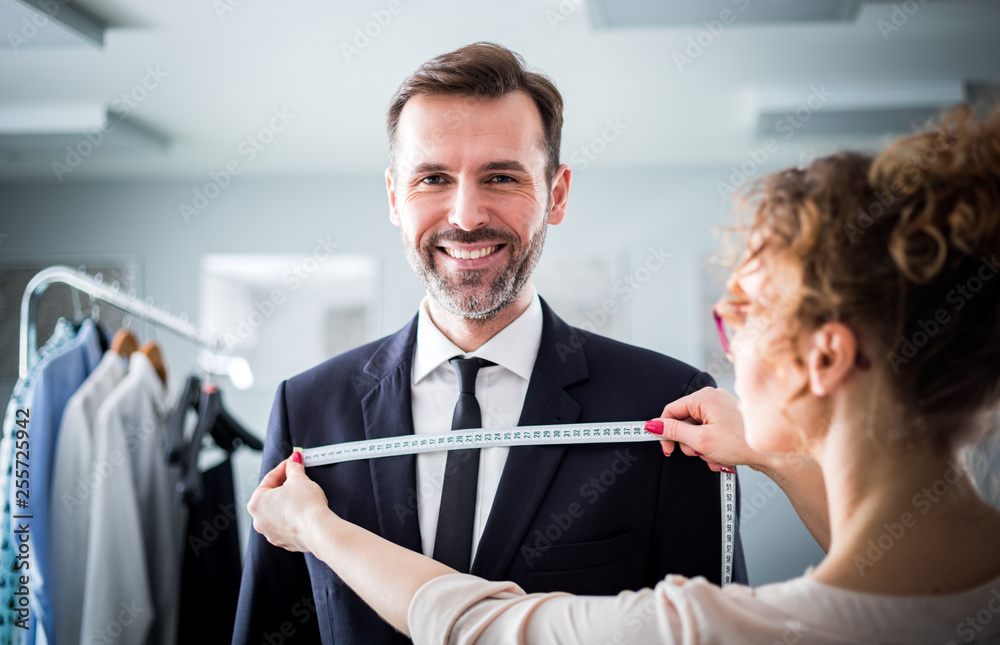 Tailor using tape to measuring smiling client for sewing suit at atelier