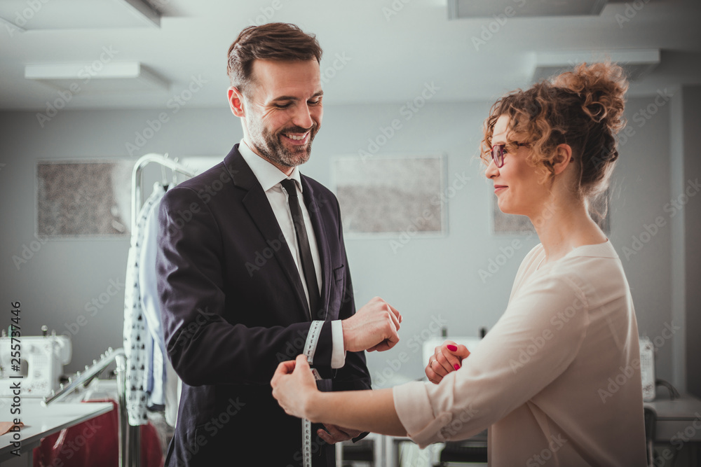 Professional tailor using tape to measuring client for sewing suit at fashion design studio