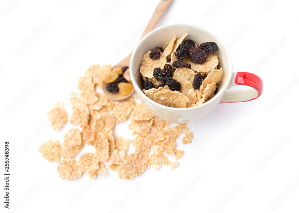 whole grain cereal flakes which mixed berry fruit and raisins for breakfast isolaed on white background