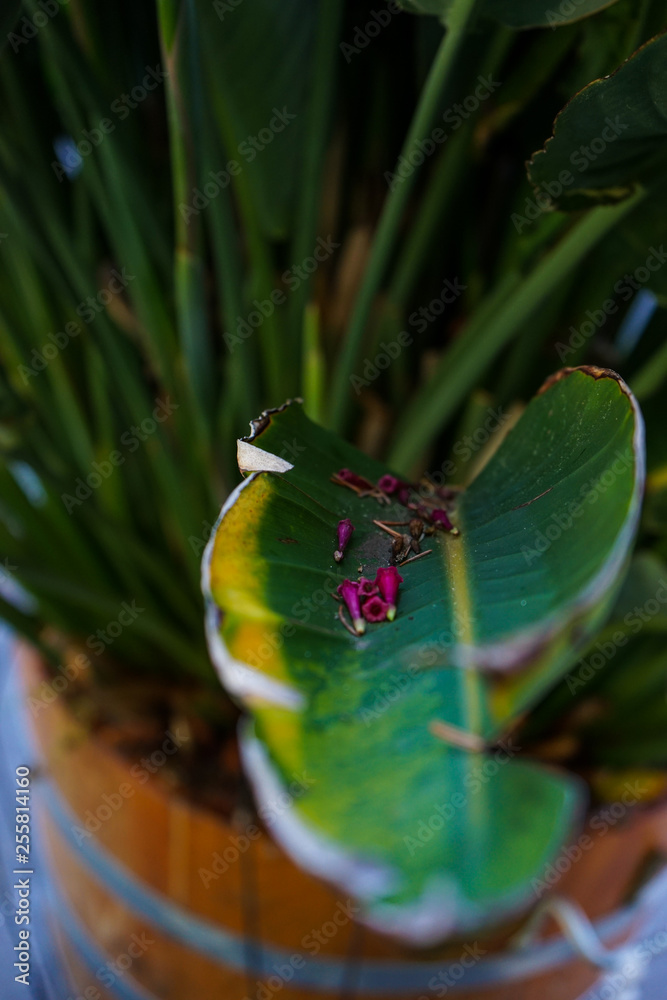 green leaves in pot of angels trumpet, brugmansia sanguinea solanceae