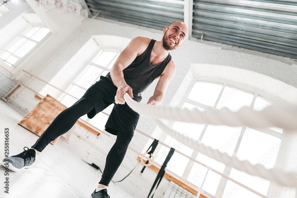 Smiling man workout with battle ropes at light gym. Muscular sportsman doing crossfit excursion with ropes in workout gym