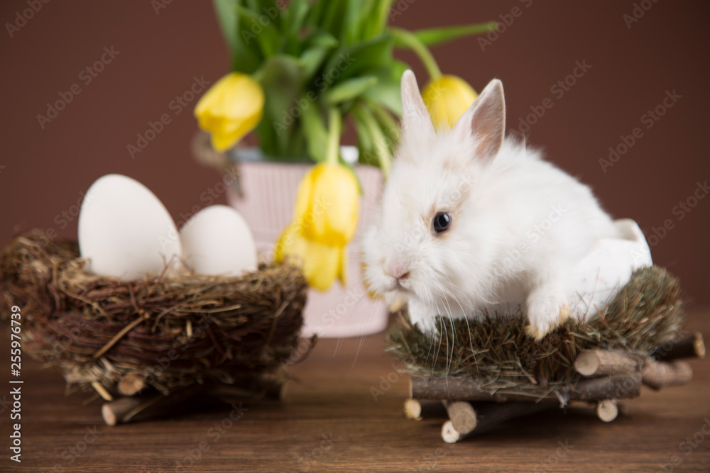 Easter rabbit in a shell of eggs. Pastel egg, flowers