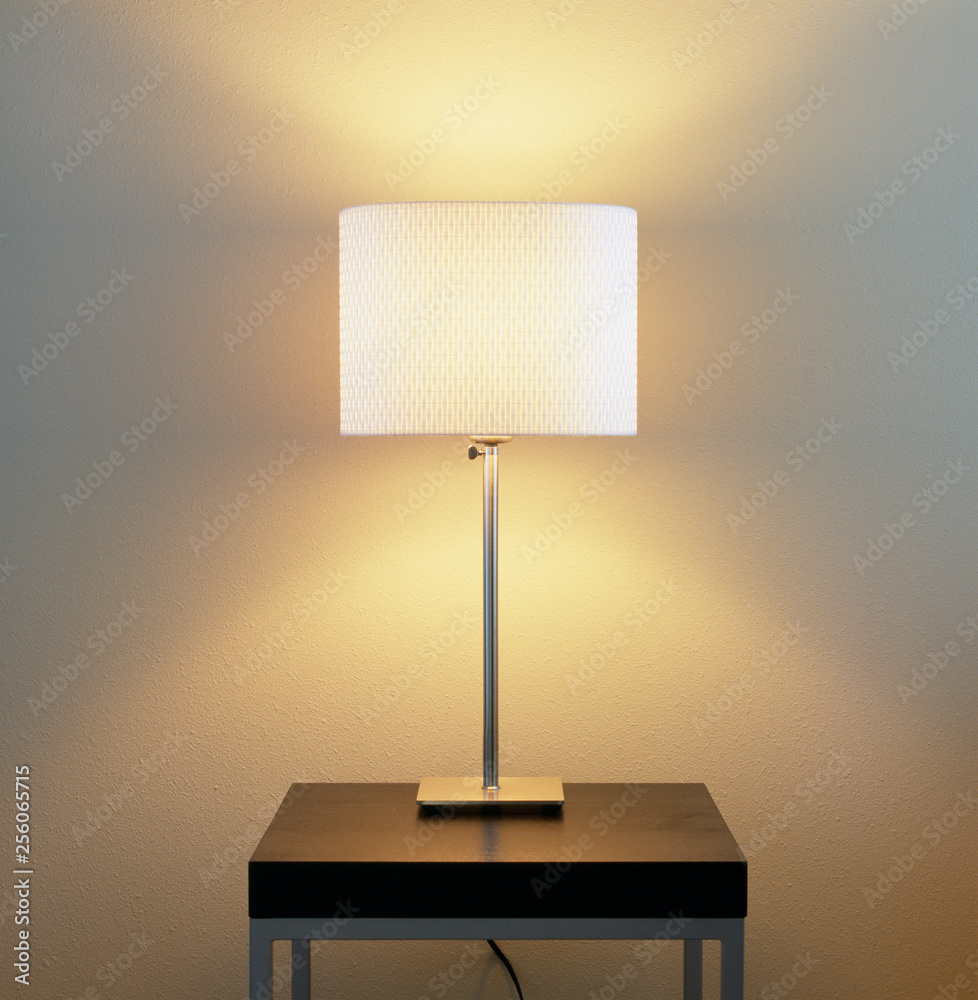 Lamp on table with painted wall background. Home energy use, electric lighting fixtures and contemporary, modern interior decor elements.