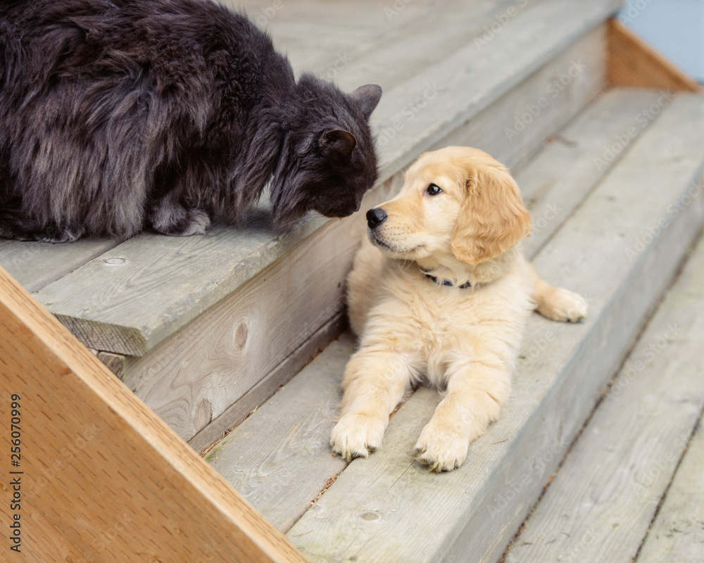 Cute, funny animal friends golden retriever puppy dog and cat pets
