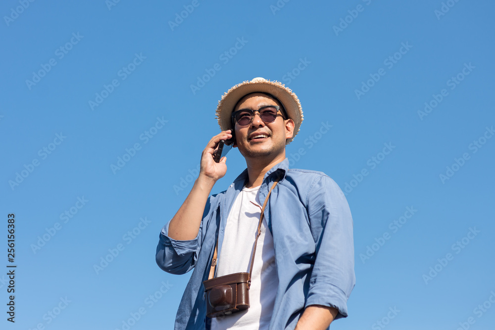 Tourist Asian man talking mobile phone with blue sky in summer. Copy space.