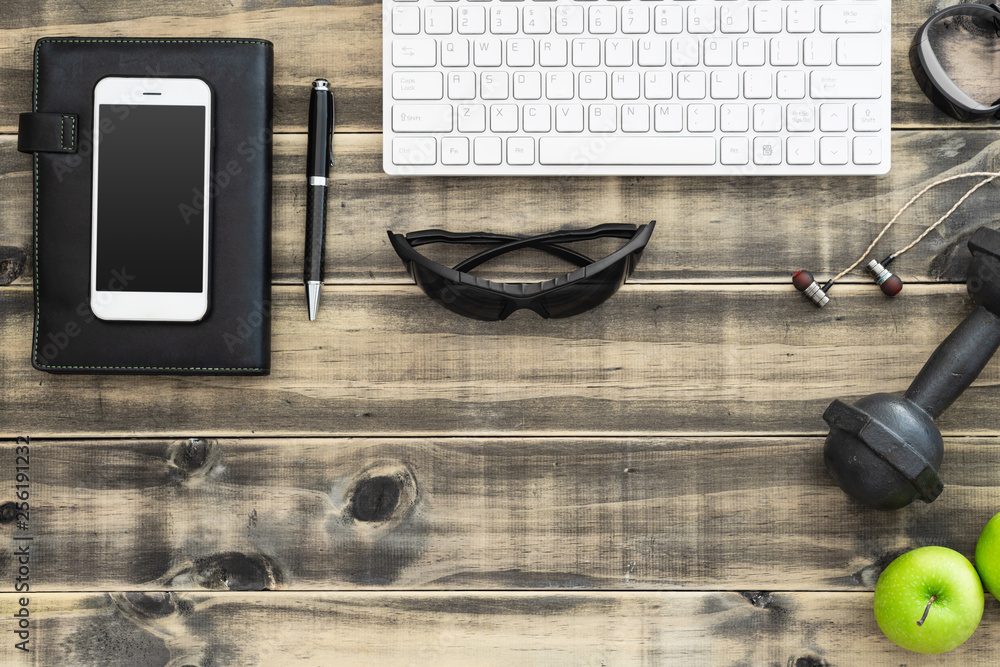 Healthy Business Active lifestyles background concept. healthy eating and active lifestyles, dumbbells, apples, smart watch, smartphone, wireless keyboard, earphone on wood background with copy space.