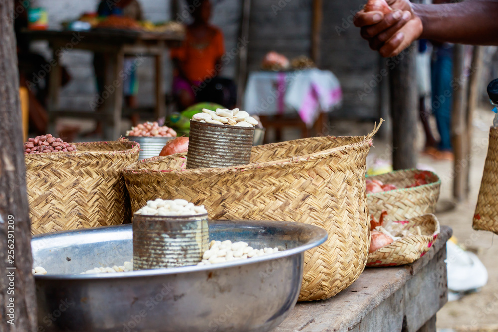 Straw baskets with beans at the food street market in Andavadoaka, Madagascar