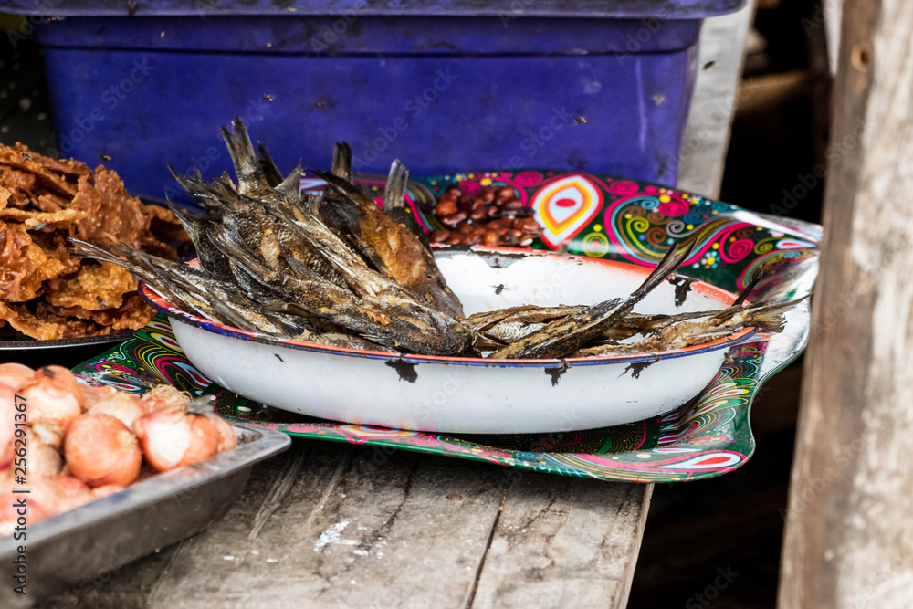 A metallic tray with fried fish to be sold at the food market in Andavadoaka, Madagascar