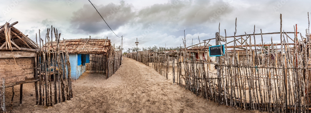 View of a street with sand and wooden fences in Andavadoaka, Madagascar.