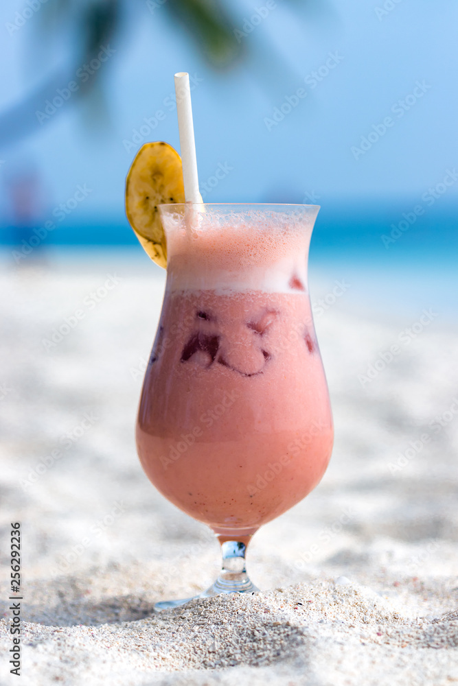 Cocktail with fruits, a slice of banana on the top and straw on the sand at a beach in Maldives