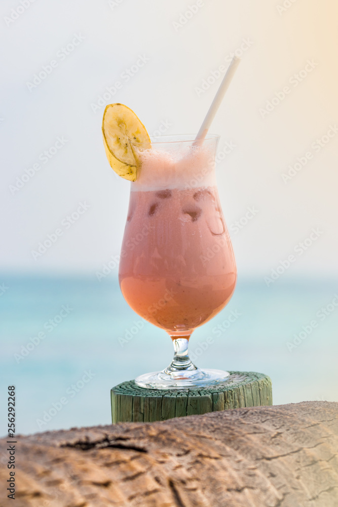 Cocktail with fruits, a slice of banana on the top and straw on a piece of wood in Maldives