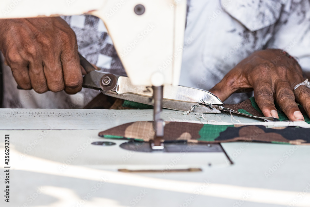 Female hands of a seamstress cutting fabric with a scissors in Galle, Sri Lanka