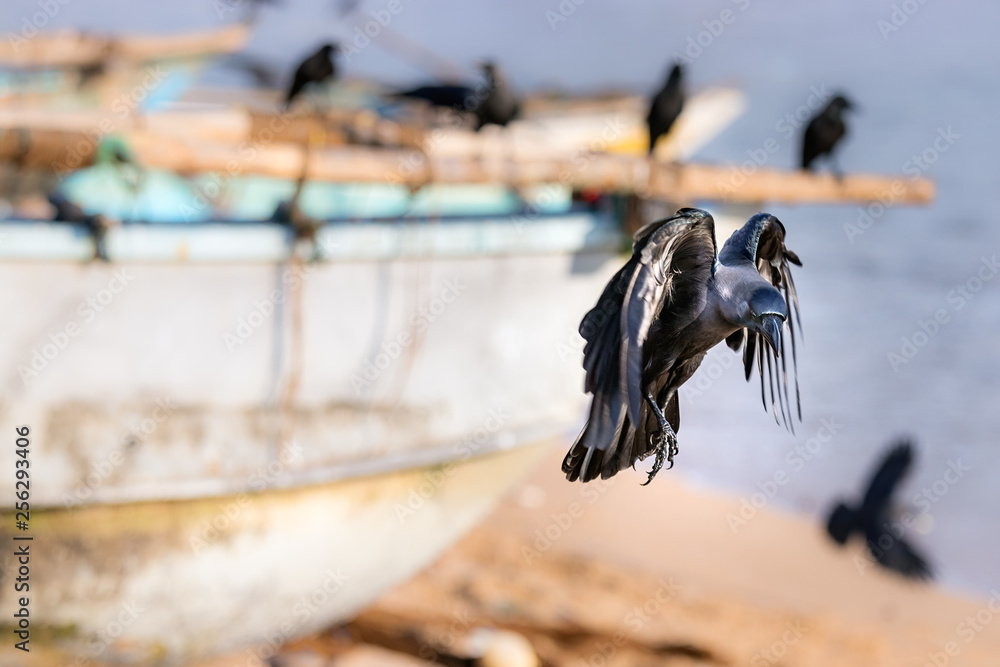 A black raven bird landing in the beach in Galle, Sri Lanka