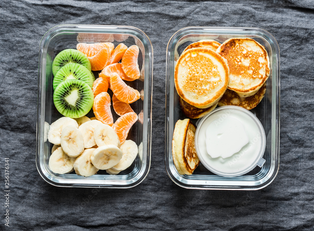 Healthy kids school, walk, picnic lunch box - pancakes with sour cream and banana, kiwi, tangerine fruit. Delicious snack on a grey background, top view