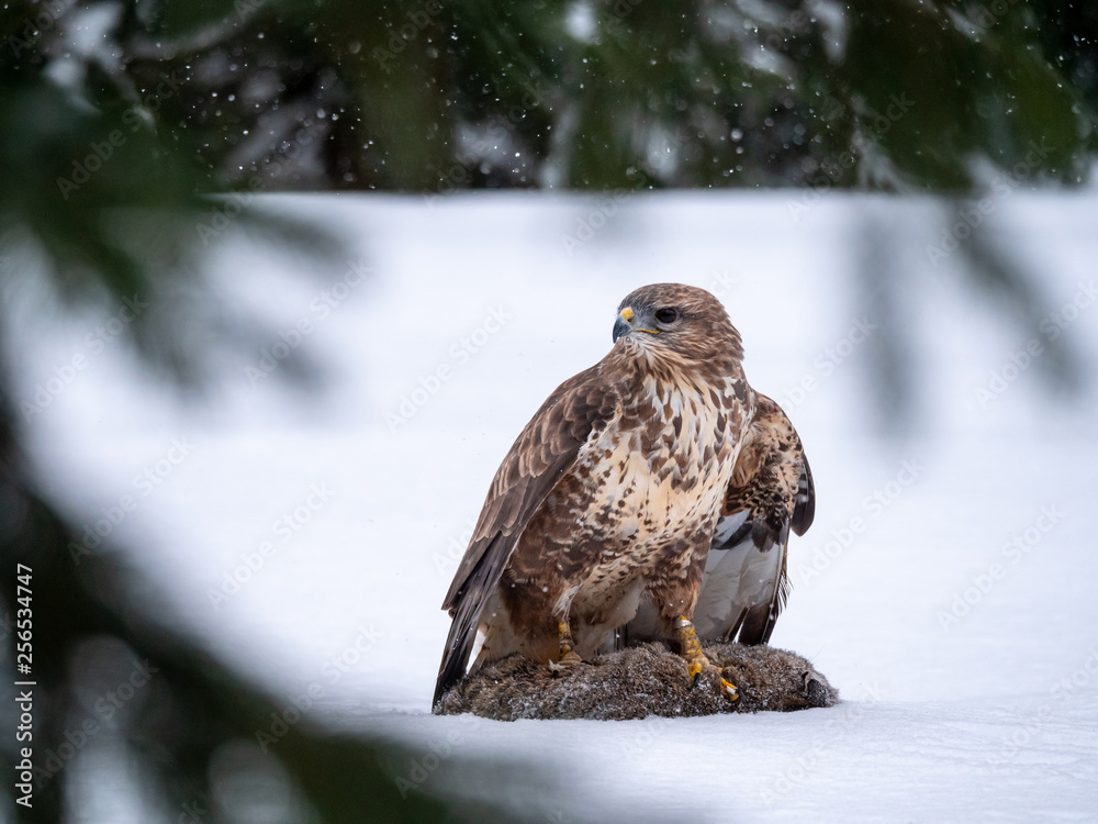 Common buzzard (Buteo buteo) with a killed rabbit on the snow. Bird of prey on snow. Common buzzard on snow.