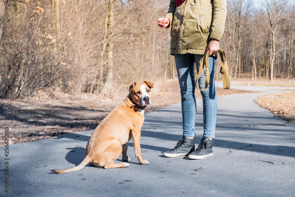 Training a grown-up dog in a park. Person schooling a staffordshire terrier in a park, dog disobeying and turning away