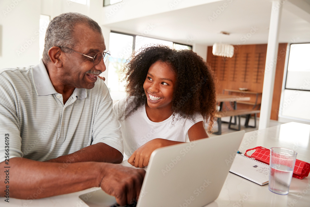 Teenage black girl helping her grandfather use a laptop computer, smiling at each other, close up
