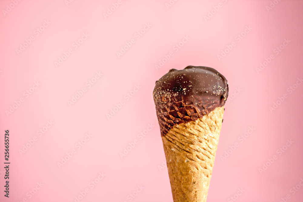 Chocolate ice cream horns. Ice cream in a waffle cone in chocolate glaze on a pink background.