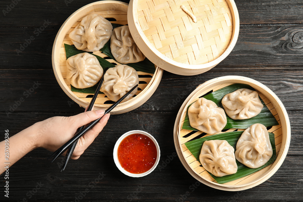 Woman cooking tasty baozi dumplings in bamboo steamers at table, top view