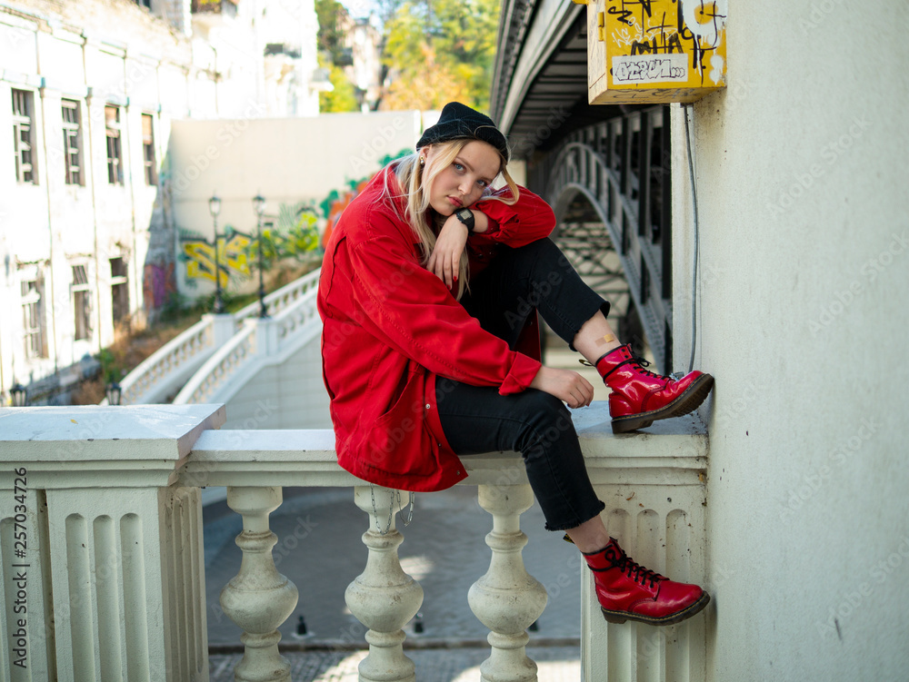 young hipster blonde girl in a knitted black hat and red jacket sitting under a bridge