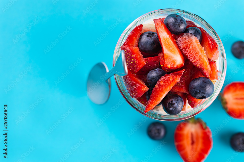 Overnight oats with chia seeds and fresh strawberries and blueberries in a glass jar. Healthy breakfast.