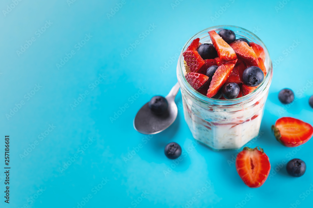 Overnight oats with chia seeds and fresh strawberries and blueberries in a glass jar. Healthy breakfast.