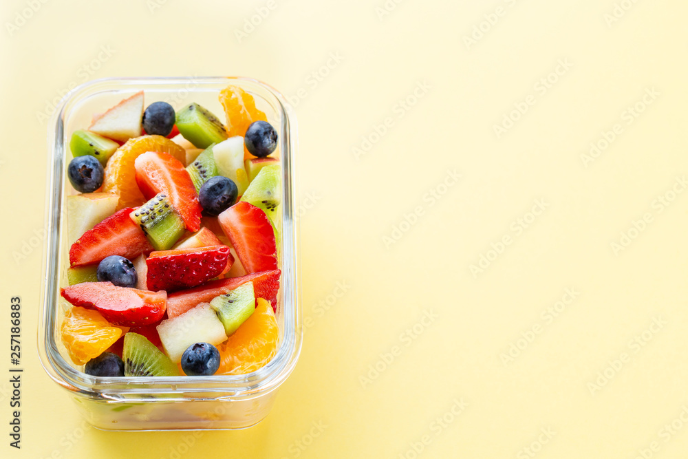 Tasty fruits in a lunch box. . Take away food. Vegetarian food.