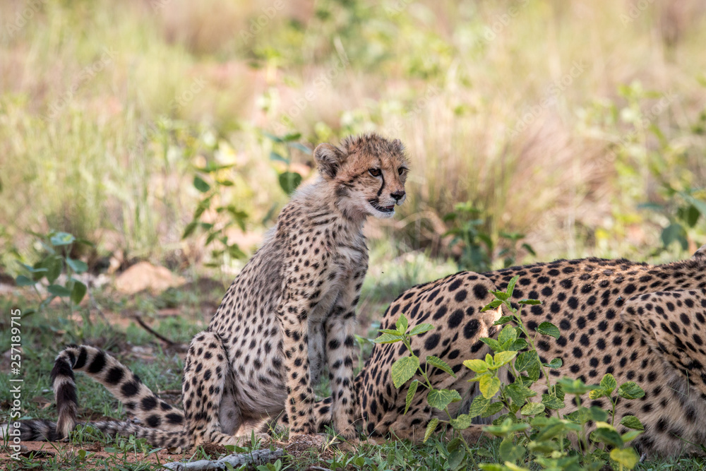 Baby Cheetah cub sitting in the grass.