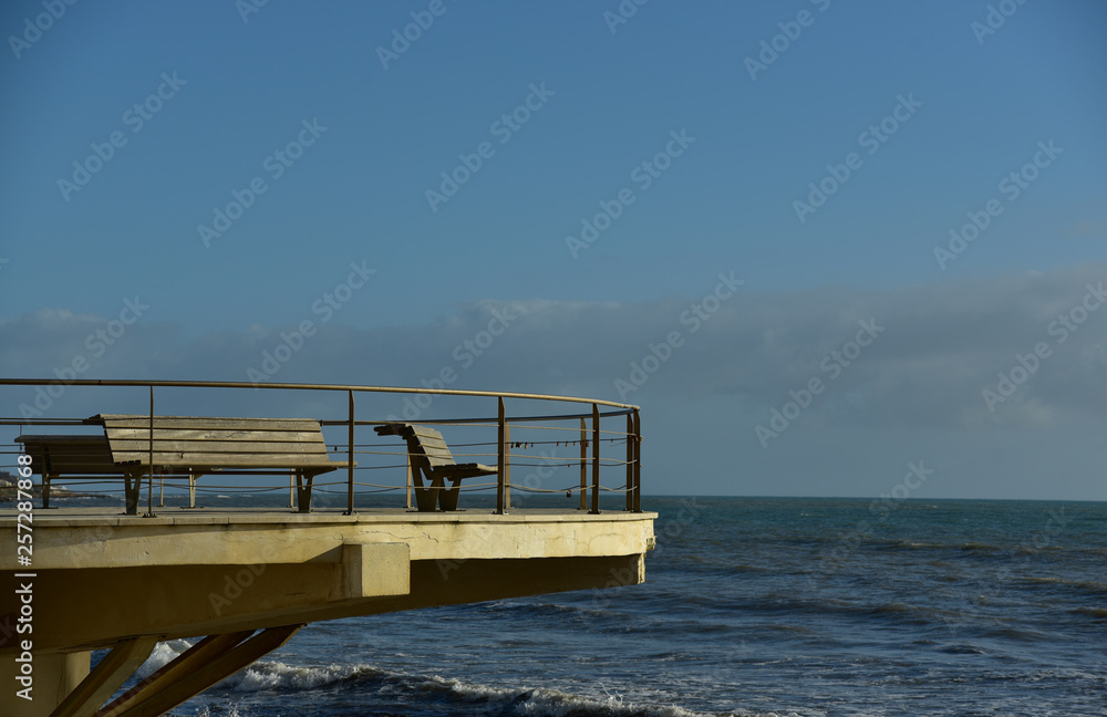 aussichtsplattform am meer mit leeren bänken