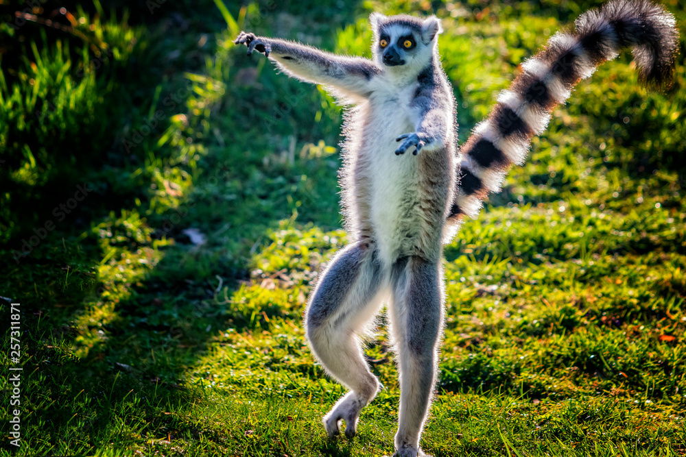 Ring-tailed lemur is dancing on green grass. He plays and performs. Like all lemurs it is endemic to the island of Madagascar.