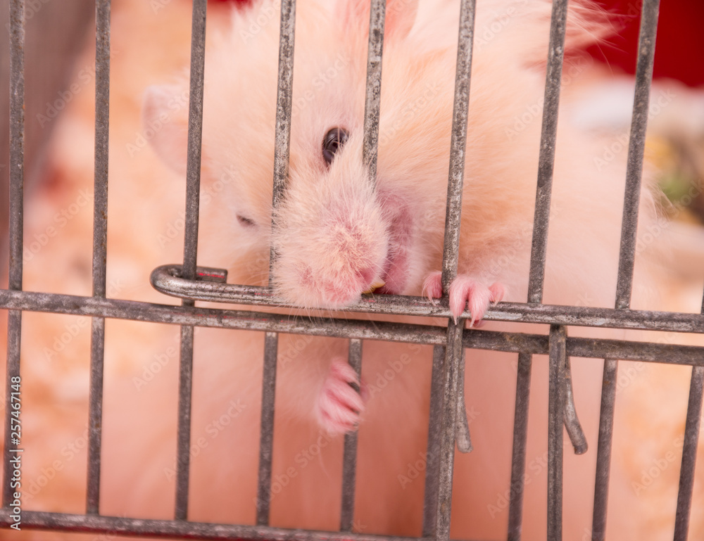 Fierce Syrian hamster gnawing on its cage bars (selective focus on the hamster teeth and paws)