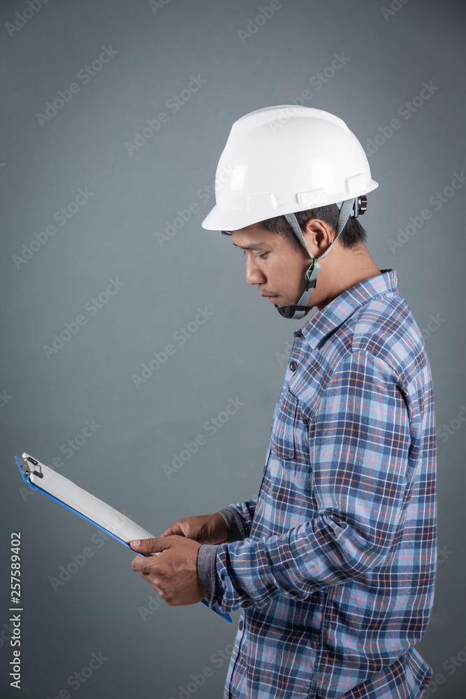Engineer holding blueprints and reading notes on clipboard while standing on gray background.