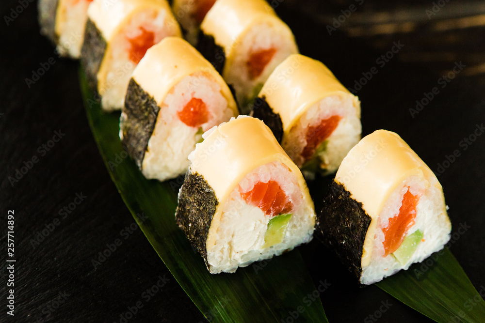 rolls with fresh fish, vegetables and cream cheese
