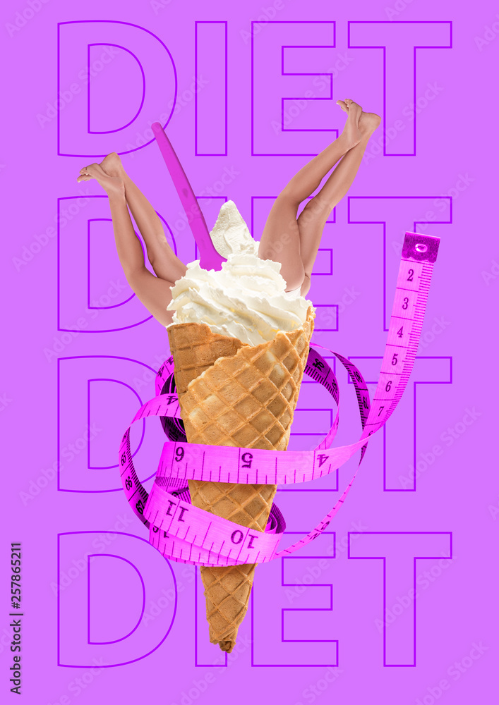 Diet and weight loss, dive in fitness. Icecream filled with female legs and pink spoony surrounded by tape measure. Healthcare and healthy food concept. Modern design. Contemporary pop-art collage.