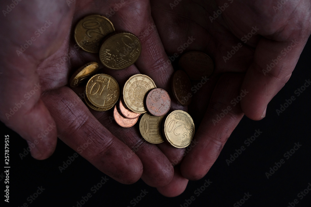 Dirty hands holding coins of euro cents on a black background, close-up. The concept of poverty, low income.