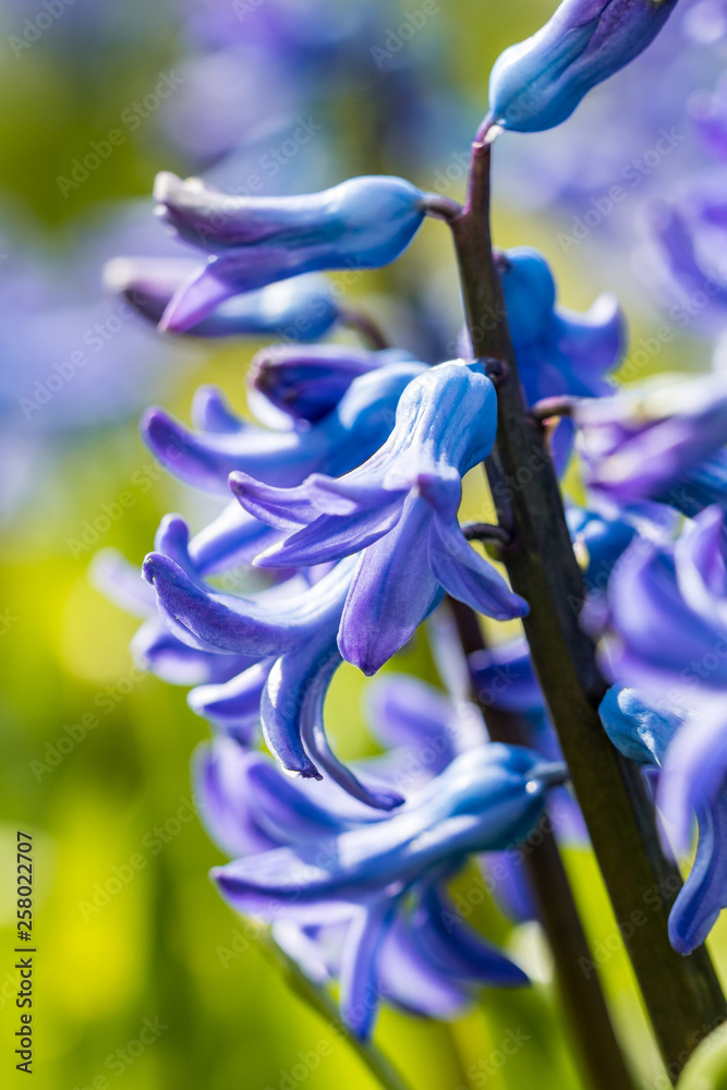 close up of couple beautiful purple Hyacinth flowers grown grass field under the sun in the park in the morning.