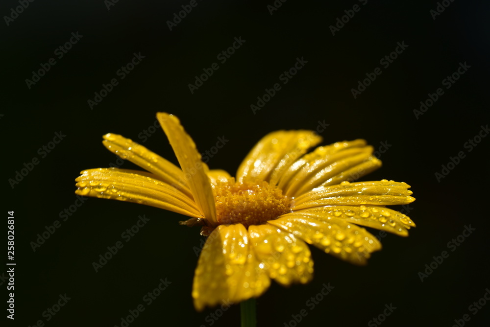 eine gelbe margerite bewegt sich im wind vor dunklem hintergrund